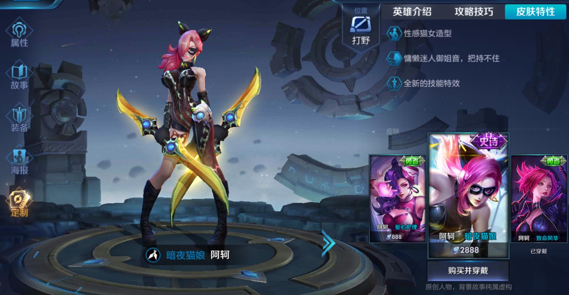 我们都知道阿珂的皮肤里面最贵的就是这款暗夜猫娘了,需要花费288人民币才能拥有,这是非常不划算的。也只有一些非常喜欢阿珂或者是非常有钱的玩家才会买入这件皮肤。相信不少有过暗夜猫娘这款皮肤体验卡的小伙伴们应该都试过这款皮肤。但是虽然这款皮肤的手感玩起来还是不错的,但是这款皮肤的技能特效以及皮肤配套的东西可以说根本就不符合它288人民币的身价。所以有不少的玩家都认为这款皮肤是阿珂皮肤里面性价比最低的一款了。相比于刚出的才卖78.8元的节奏热浪无论是从性价比还是从技能特效的方面都是没法比的。