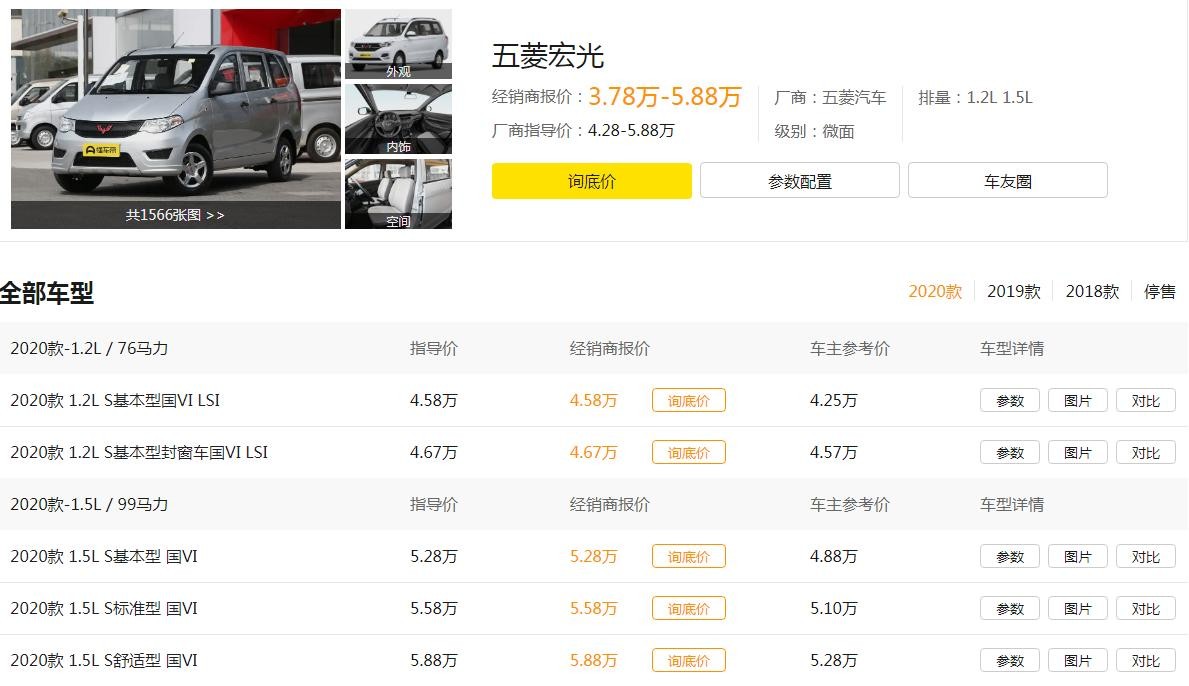 五菱宏光的厂商指导价为4.28万-5.88万元,经销商给出的报价为3.78万-5.88万元。它的车型版本较为丰富,新款车型有着五个版本,分别是基本型 LSI、基本型封窗车LSI、基本型、标准型、舒适型。这款车型的配置不高,它全系标配的主动安全基础配置只有ABS防抱死、制动力分配。后驻车雷达和倒车影像只有顶配的舒适性车型上有配备,标准型和舒适型的车型版本有着车顶行李架和铝合金轮毂。车内中控锁为全系标配,标准型和舒适型带有遥控钥匙、行李舱12V电源接口。顶配版的舒适型带有蓝牙/车载电话、手机互联映射。标准型和舒适型带有前雾灯的配置,后车窗可以进行电动调节,全系车型均有着前车窗调节功能。舒适型有着电动调节外后视镜、后雨刷。