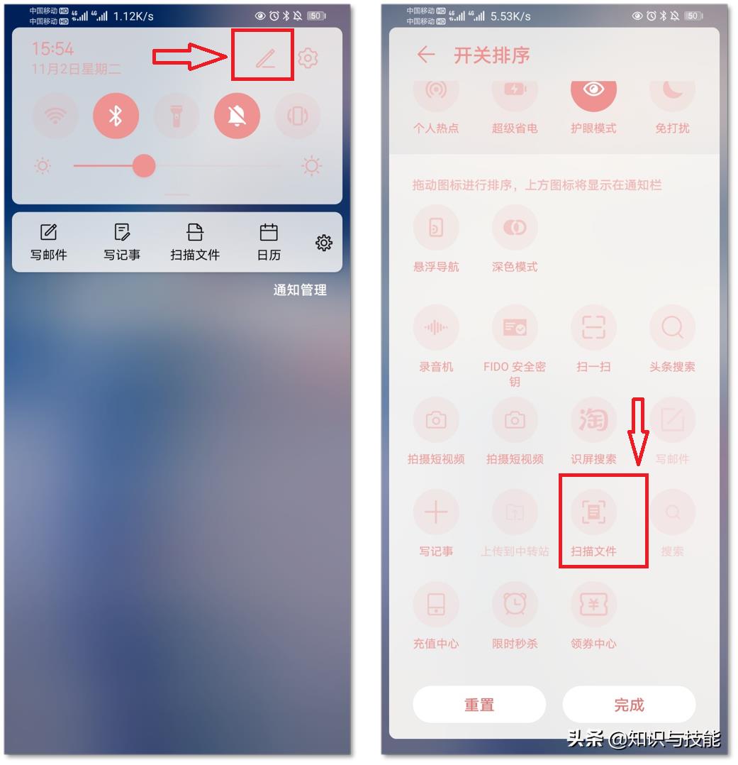 操作方法:首先从手机顶部往下滑,就可以打开手机的【通知栏】,接着点击【编辑】图标;找到【扫描文件】功能,点击启用。