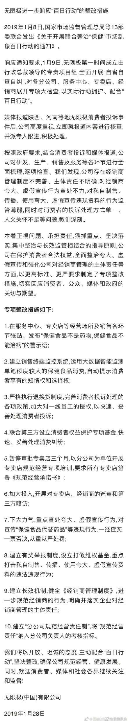 承认经销商夸大宣传 无限极推10条整改措施内容详情