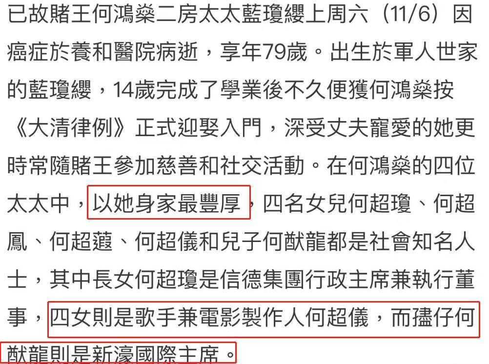 但不能否认的是,蓝琼缨不光有背景,也有非常强的能力,否则也不会一房独大,被赌王偏看一眼了。而蓝琼缨去世,孩子们都在身边也是应该的,想必当天的情况和赌王去世时子女都在身边差不多。