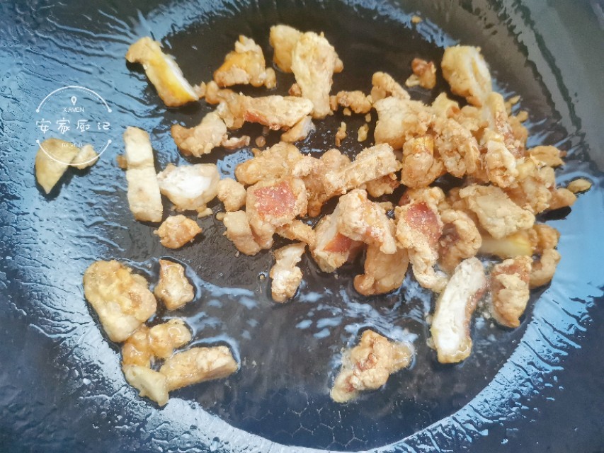 4、热锅凉油,开小火,放入花椒粒炒香,放入油渣炒出底油