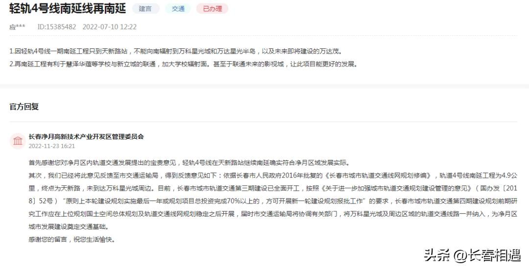 之前有净月区居民咨询关于轻轨4号线南延线再南延的问题。得到的官方回复是轨道4号线南延工程为4.9公里,终点为天新路,未到达万科星光城周边。长春市城市轨道交通第四期建设规划前期研究工作应在上位规划国土空间总体规划及轨道交通线网规划稳定之后开展,届时市交通运输局将协调有关部门,将万科星光城及周边区域的轨道交通线路一并纳入,为净月区城市发展建设奠定交通基础。
