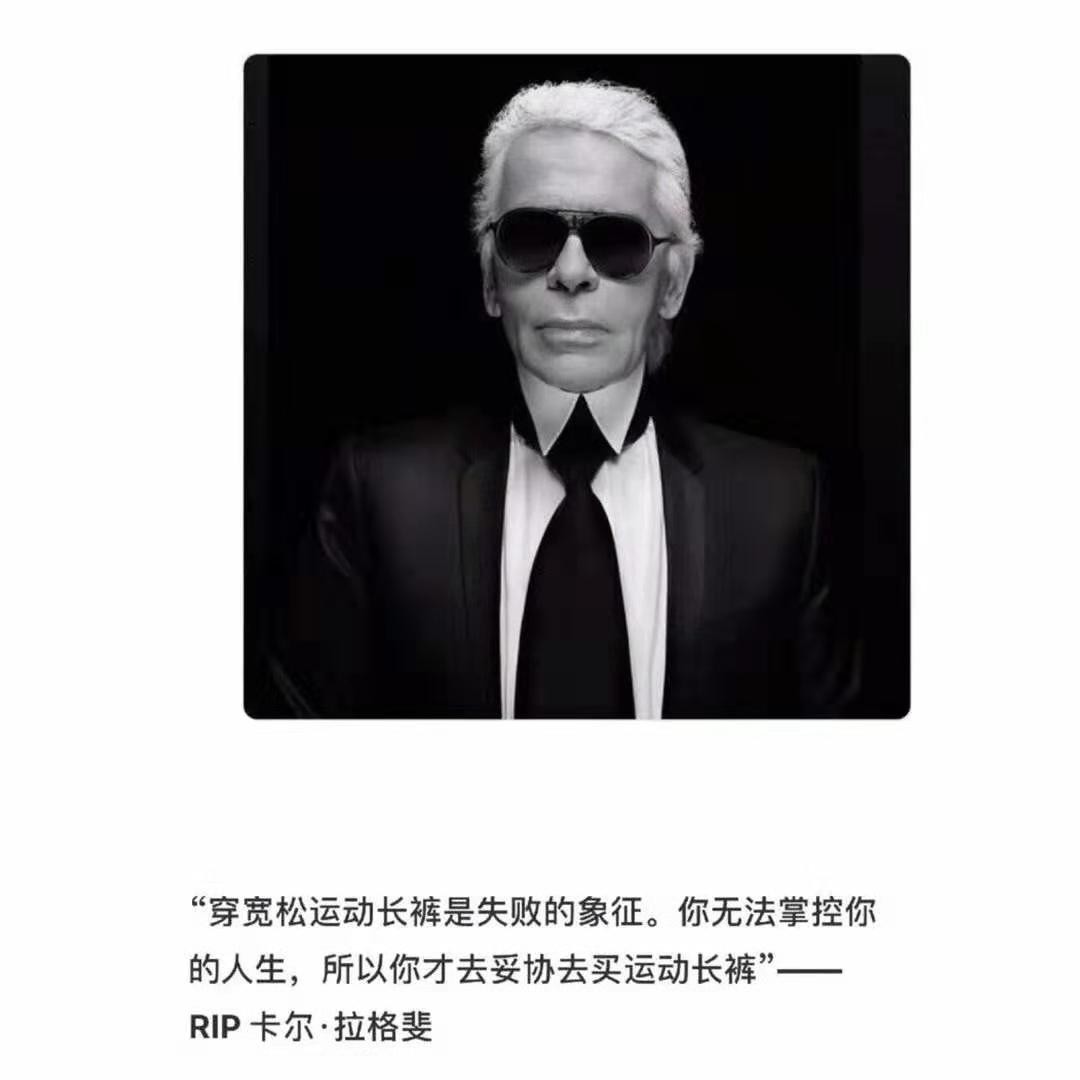 老佛爷曾说过,“穿宽松运动长裤是失败的象征。你无法掌控你的人生,所以你才妥协去买运动长裤。”