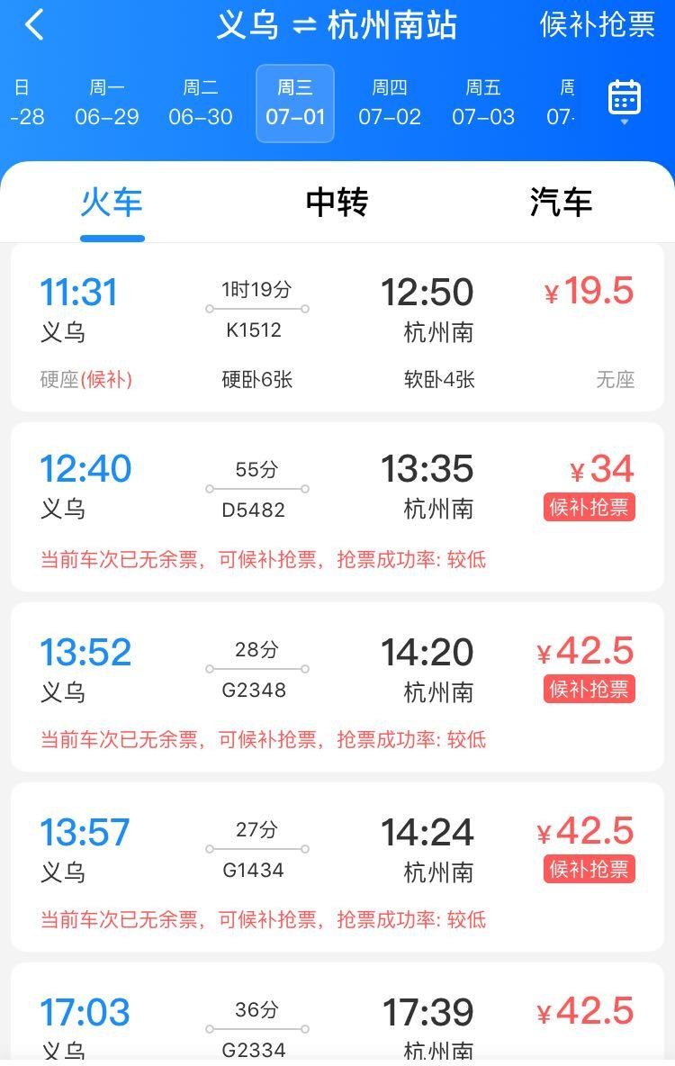 12306售票系统显示,目前义乌到杭州东G字头列车最快31分钟,二等座票价50元;7月1日金华至杭州南每天有4趟G字头列车经停,最快的G1434次及G7496次列车仅需27分钟,二等座票价42.5元。