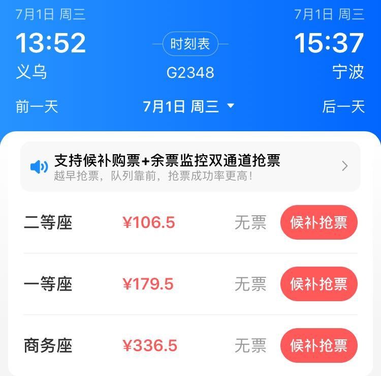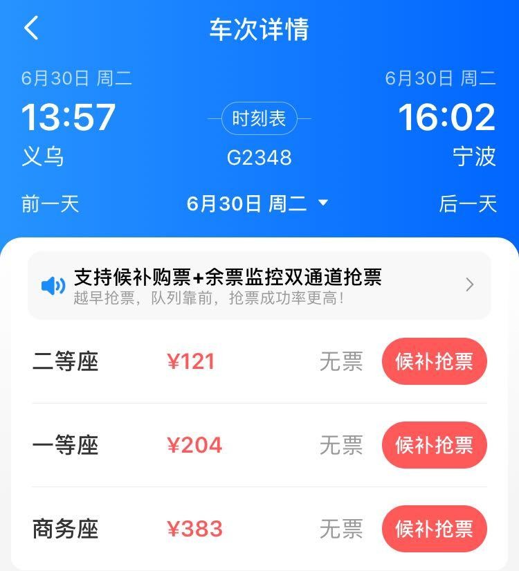 G2348次列车途经义乌、杭州东站前往宁波,在6月30日未铁路调图前,义乌前往宁波需2小时5分,二等座票价为121元;而7月1日铁路调图后,途经的杭州东站变成了杭州南站,义乌前往宁波需1小时45分,二等座票价为106.5元。