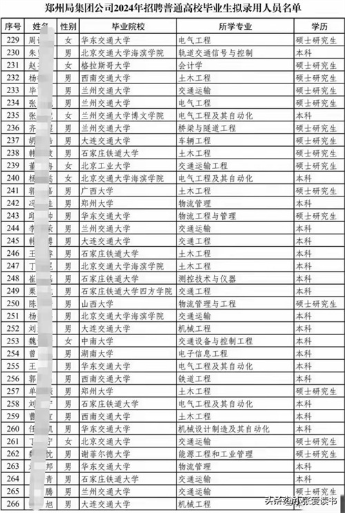 2024年咱们中国铁路郑州局招新毕业生的名单已经正式贴出来啦!这回总共招了2240位小伙伴,学历嘛,从大专到研究生都有,厉害吧!具体说说,研究生有124位,本科生有264位,大专生最多,有1852位呢。