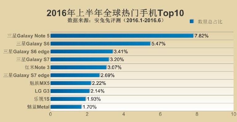 从全球的榜单来看,2016年上半年全球热门手机TOP10榜单中,三星旗下的Galaxy Note以及S系列在全球范围内都十分受消费者的喜欢,这是因为三星手机是对标苹果iPhone的品牌,不买苹果手机的国外用户,首选的就是三星手机。而在国内比较吃香的性价比千元机,像是红米Note 3,红米Note 2、乐视1S在在国外一样吃的开,在全球同样很受关注。