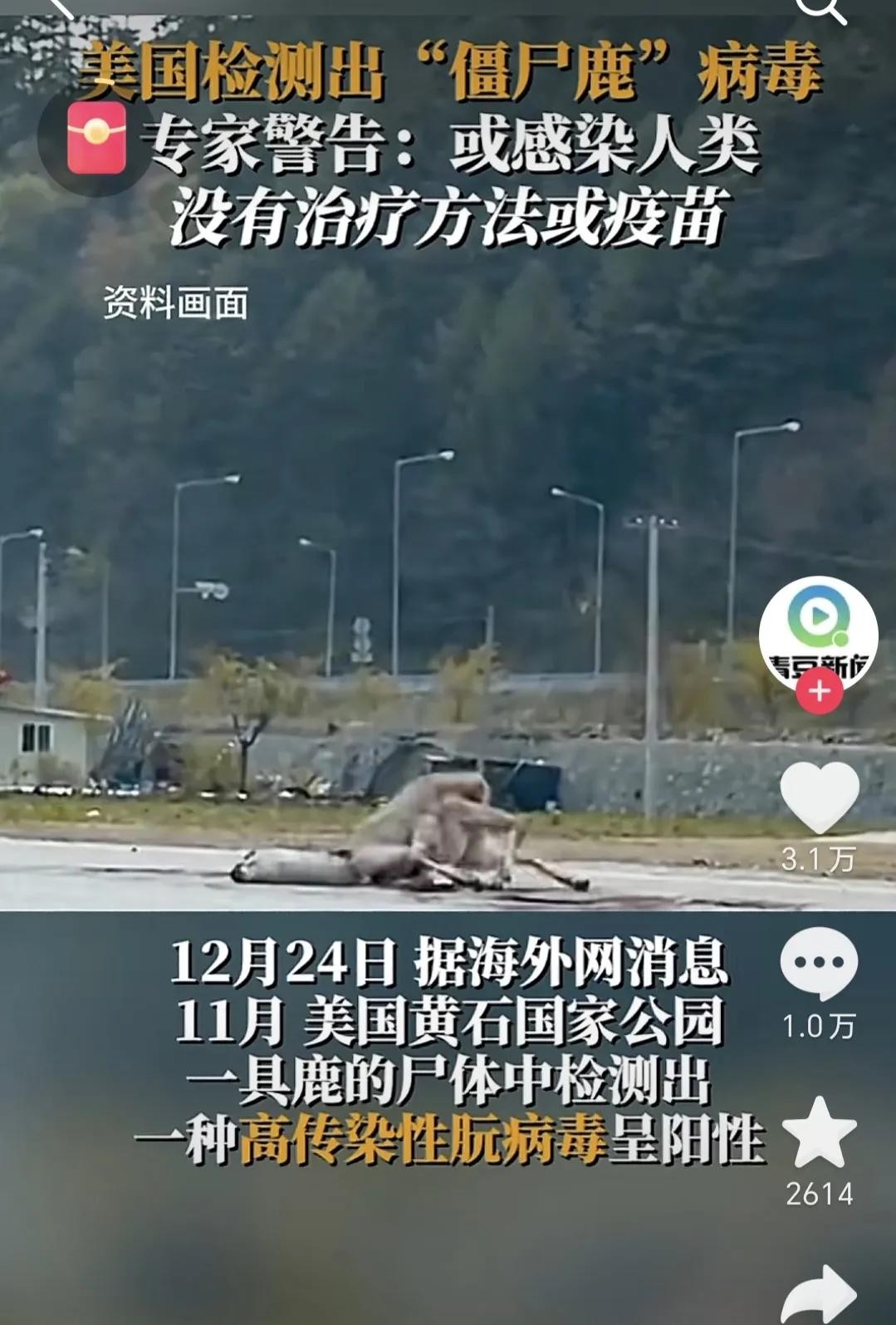 近日,美国黄石国家公园的一具鹿尸体中被检测出一种高传染性朊病毒,这引发了人们对该病毒可能对人类健康带来的潜在威胁的担忧。据报道,僵尸鹿病毒会导致动物出现流口水、神经系统症状等严重疾病,并且目前还没有治疗方法和疫苗可供使用。