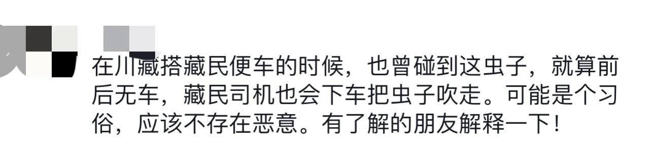 经了解,原来是冬虫夏草的幼虫!而且在藏区很多藏民就是以此为生,并且早前就有网友拍到藏民自己也是会下车把虫子弄走,看得出来这是藏民自己的文化习俗,生态保护意识很强!但是随便在国道上拦停车是不是不太合适?会不会有安全隐患?