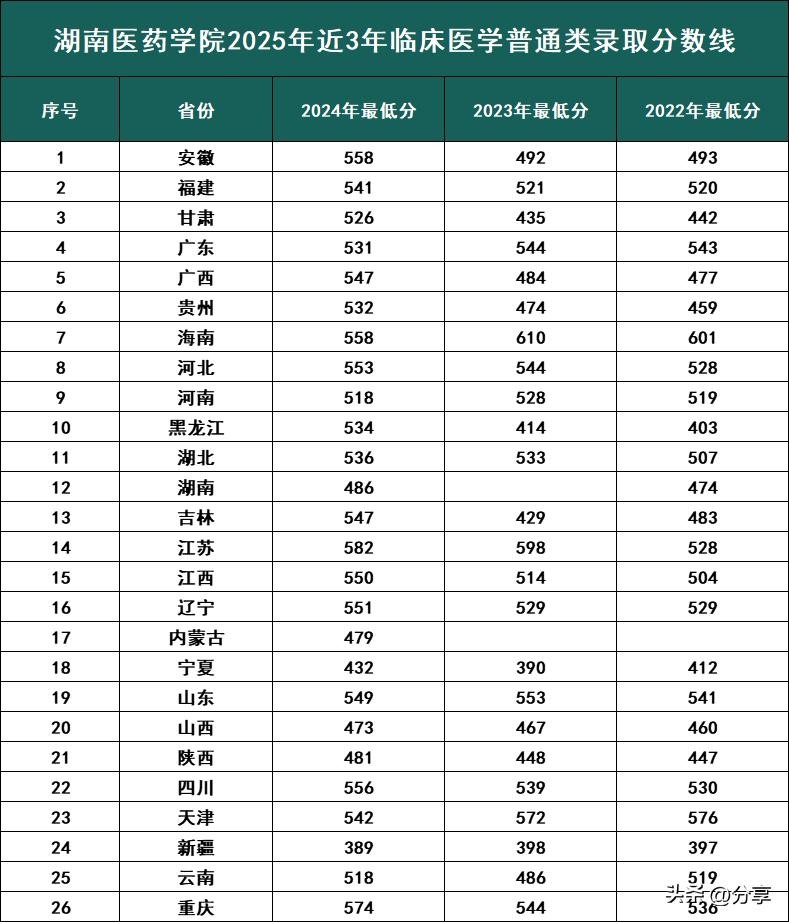湖南医药学院 2025年近3年临床医学专业普通类全国26个招生录取省区市:安徽 、 福建 、 甘肃 、 广东 、 广西 、 贵州 、 海南 、 河北 、 河南 、 黑龙江 、 湖北 、 湖南 、 吉林 、 江苏 、 江西 、 辽宁 、 内蒙古 、 宁夏 、 山东 、 山西 、 陕西 、 四川 、 天津 、 新疆 、 云南 、 重庆;以下录取分数对比解读!