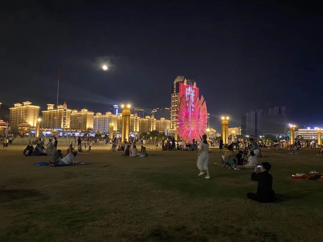 在皎洁的月亮照耀下,市民置身于岭秀湖市民公园的璀璨灯海中。网友HH/摄