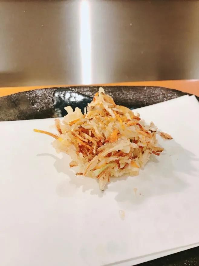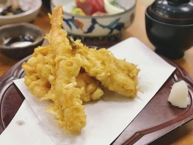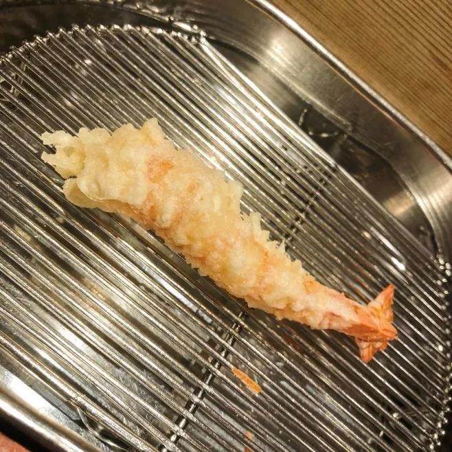 现在我们去到日料店,习惯的点上炸物,炸物对油温的把控真的是十分讲究,那金黄的天妇罗大虾真的是太诱人了,热的大虾天妇罗蘸上酱汁,吃起来依旧还是那么鲜美,巧妙的化解了炸物的油腻感,嚼起来的那声“咔嚓咔嚓”的声音太幸福了。