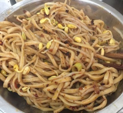 干扣面是亳州涡阳地区的一种特色面食,它的食材相当简单,就是以面条和黄豆芽为主,辅以蒜汁、葱花、味精、胡椒、食醋、香油、酱油等,将它们与面条和黄豆芽搅拌均匀后,再在上面放油炸辣椒就行了,怕吃不饱的,还可以加狗肉或者酸汤鸡蛋,也是非常不错的搭配。