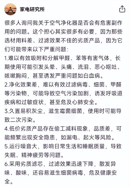 当下,我们更需警惕那些频繁虚标参数、热衷制造虚假卖点、甚至采用劣质材料的产品,它们在实际测试中的过滤净化能力令人大跌眼镜,甲醛处理能力低下,直接威胁我们的生命健康,可能引发呼吸、心肺等多种疾病,甚至增加致癌风险。因此,在选择空气净化器时,我们必须审慎行事,确保每一次呼吸都纯净健康,无忧无虑。