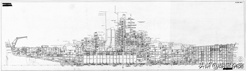 注意主炮塔是如何消耗多个楼层的,从广义上讲,船员住在1号炮塔前面和3号炮塔周围,CPO在更靠后的位置,2号炮塔后面的军官,上层建筑中的上尉和海军上将等。机械和弹匣在底部。