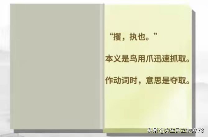 (1)《说文》中记载:“攫,执也。”本义是鸟用爪迅速抓取。作动词时,意思是夺取。