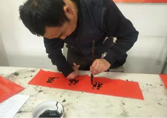 活动现场浓墨飘香,各书法家的桌子前有序排满了前来“求字”的群众,书法老师们在大红洒金底的对联纸上现场挥毫泼墨,行书、楷书、草书等各式字体跃然纸上,其中一位书法家受到群众们的特别关注,那就是用左手依然把春联书写的很漂亮的童全老师。