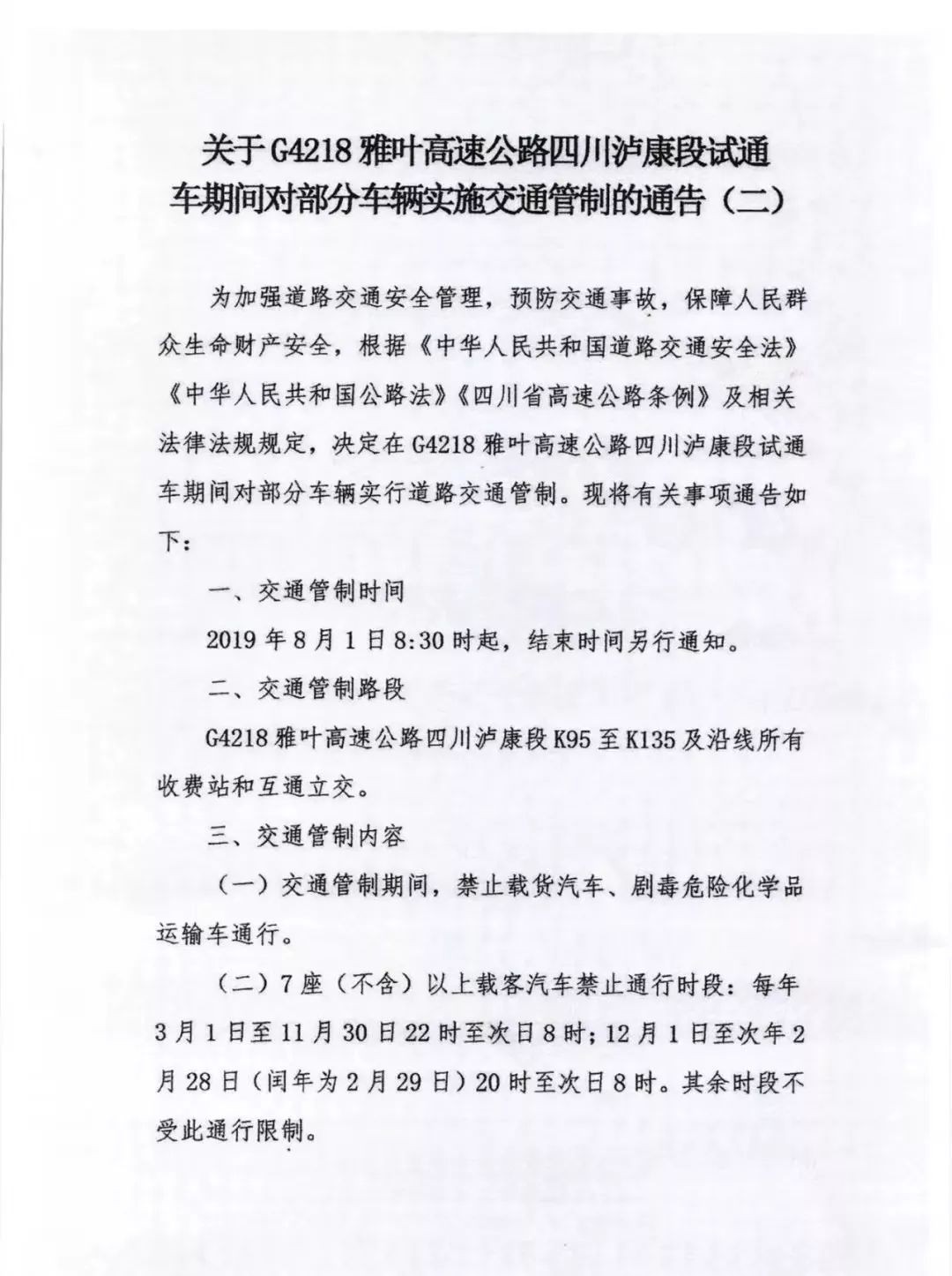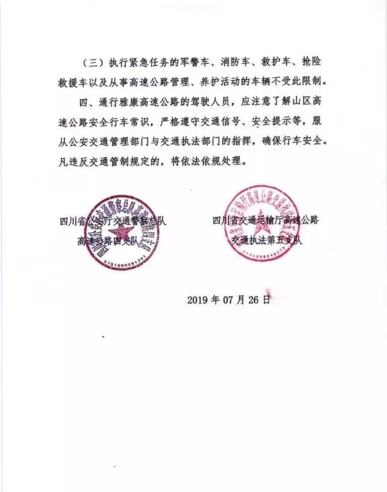 7月26日,四川省公安厅交通警察总队高速公路四支队和四川省交通运输厅高速公路交通执法第五支队联合发布通告,从2019年8月1日8:30时起, G4218雅叶高速公路四川泸康段将对部分车辆实行道路交通管制。