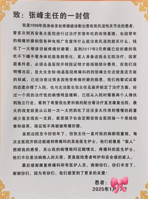 张峰表示:“这是我们团队在春节来临之际收到的最好的礼物!让我们珍惜病人的这份信任和托付,努力提升业务水平,团结协作,来年更上一层楼!”(供稿:泾阳县医院)
