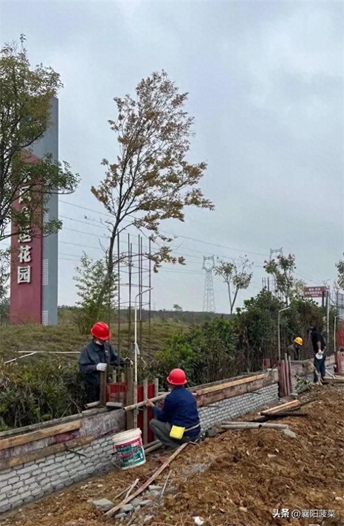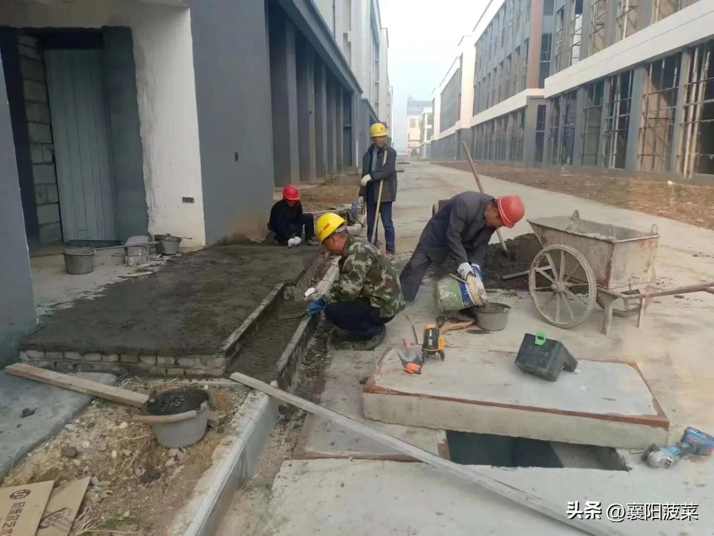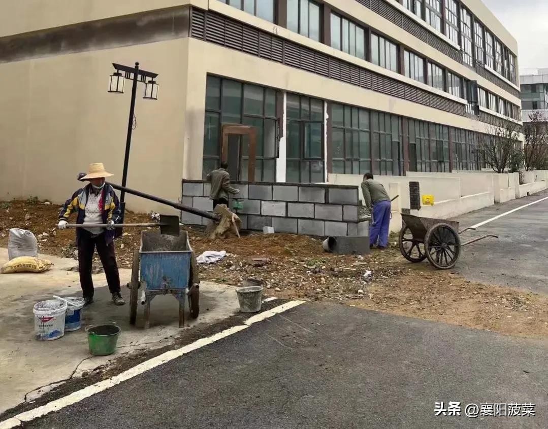 图片显示,有的工人在砌墙,有的在给围墙扎钢筋,有的在检查电梯安装情况,有的在为硬化路面作准备,有的正刷墙漆。