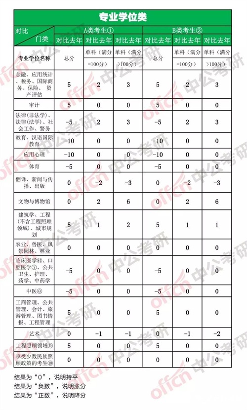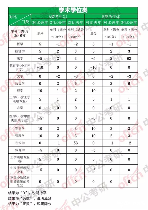再来一个超详细的对比图,为了更直观的来体现每个学科门类、每个单科的涨幅,中公考研小编又给大家准备了下面对比图: