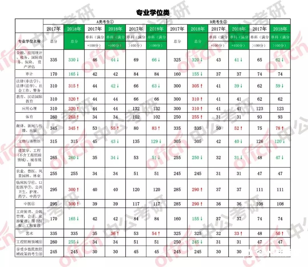 注:2017年与2018年分数线对比)红色为上涨,绿色为下降