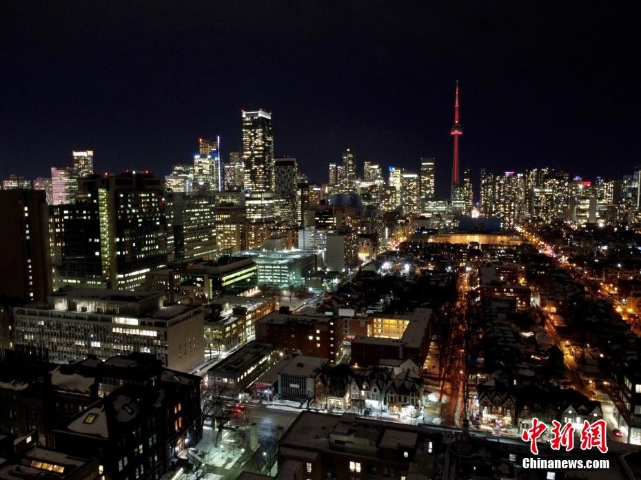 加拿大国家电视塔用灯光点亮“中国红”,庆祝虎年春节。(无人机照片) 余瑞冬 摄