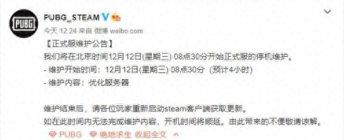 绝地求生12月12日维护公告 今天吃鸡更新到几点开服时间