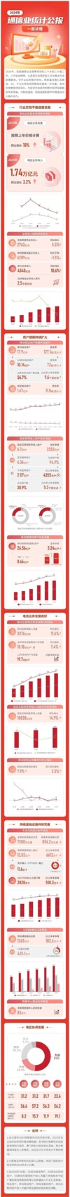 经初步核算,我国 2024 年电信业务收入累计完成 1.74 万亿元,比上年增长 3.2%。按照上年价格计算的电信业务总量同比增长 10%。