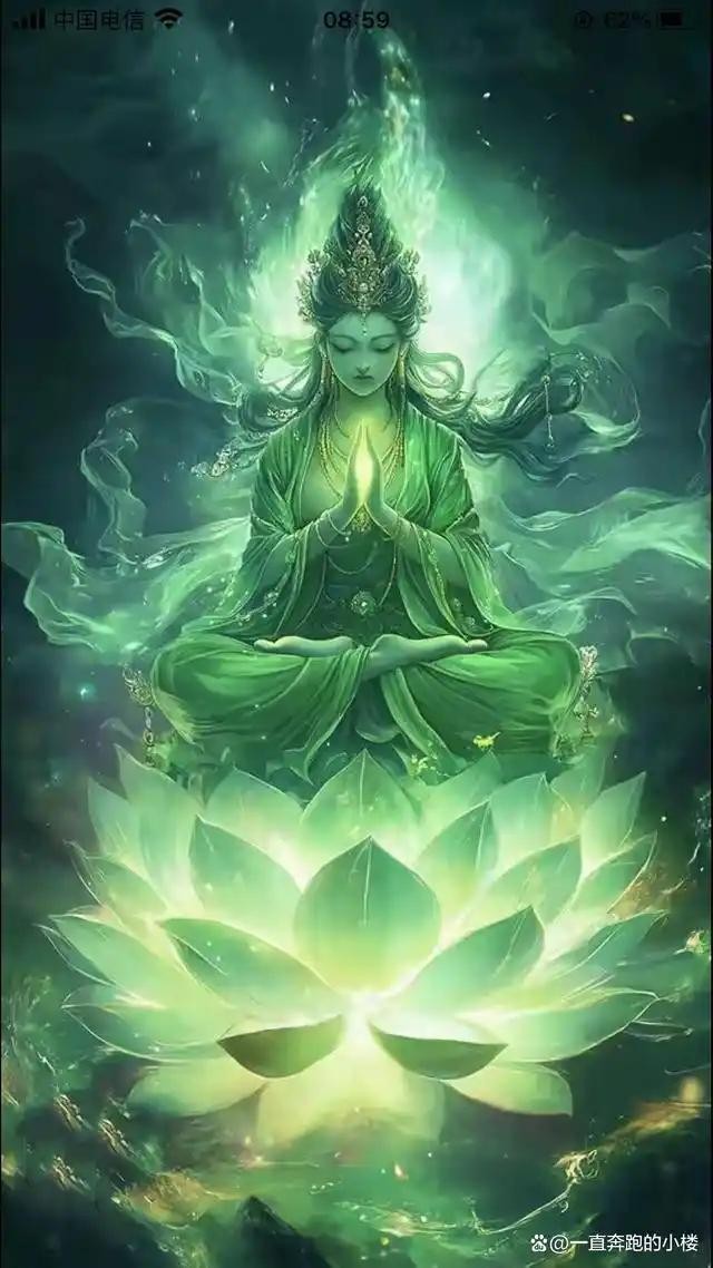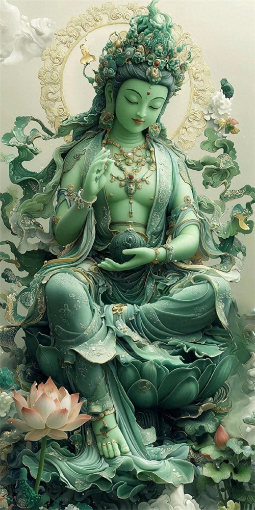 在藏传佛教中,绿度母的形象通常是一位美丽的女性,手持莲花,端坐在莲花上。她的颜色通常是绿色,象征着青春和生命的永恒。绿度母不仅是慈悲的象征,也是智慧的象征,提醒我们在困境中保持慈悲和智慧的心态。她能够带来安慰、平静和内心的宁静,不仅限于物质层面,更包括精神层面的安抚与守护。