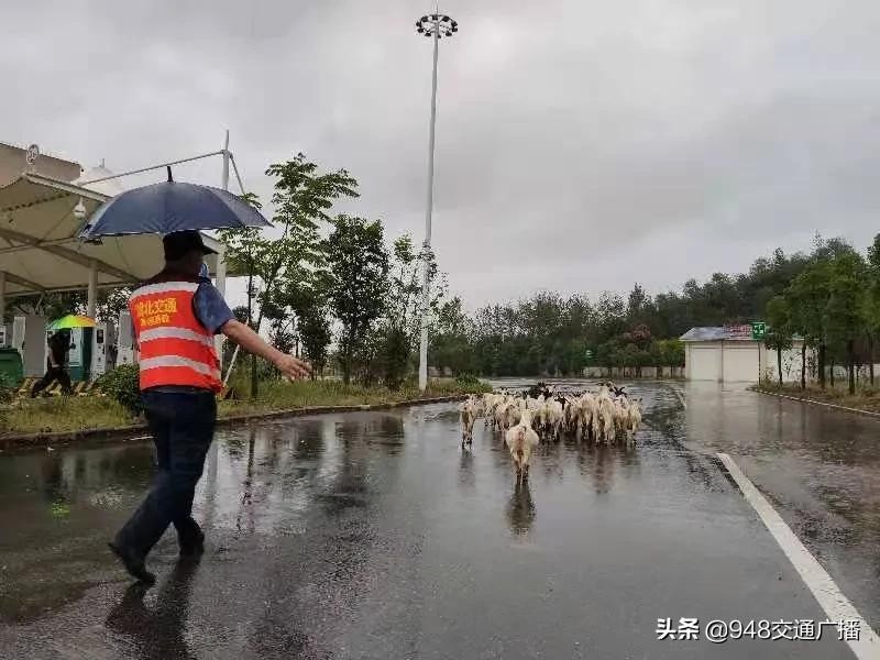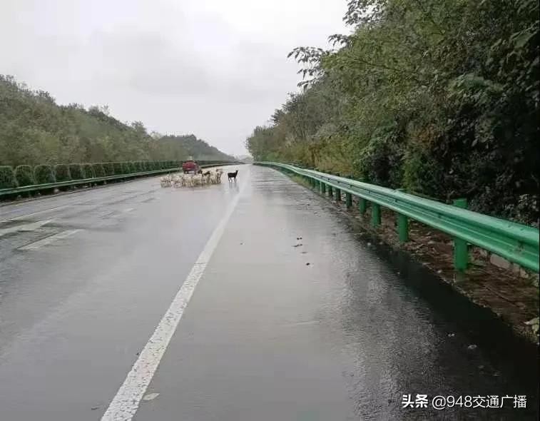 中国交通广播10月6日消息(通讯员 魏飞)10月5日下午15时许,湖北交通高速路政汉十支队第七大队执法人员在G4213麻安高速公路宜保段巡逻至南漳服务区附近时,发现前方行车道上有一群羊正慢慢悠悠地在雨中“散步”,旁边不时有呼啸而过的车流,场面颇有些惊心动魄。