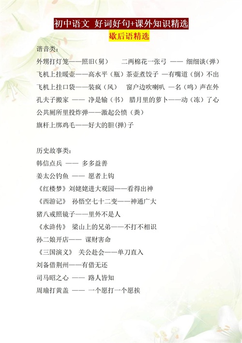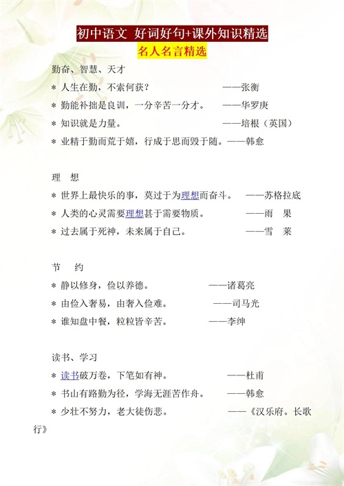 写作是运用语言文字进行表达和交流的重要方式,而好的作文离不开好词好句的积累。今天,我会分享初中语文好词好句素材以及课外精选知识。内容上会包含描写人物品质、人物外貌、勤奋学习等等词语以及来自历史故事,语言故事、神话故事等的成语;劝学类、送别类、友情类、心情类等的句子;另外也会分享格言、俗语、谚语、歇后语等。