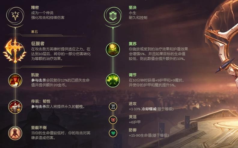 先带大家了解一下他的技能,被动技能每五秒恢复自身百分比生命值,和盖伦被动类似但是战斗中可以触发,盖伦的被动必须脱战才可以触发,一技能消耗自身生命值向前方扔出一把菜刀,造成敌方最大生命值百分比伤害和减速效果,如果命中目标会恢复自身生命值,击杀目标恢复效果增强,二技能在自身周围生成光环对敌人造成持续魔法伤害,(自带日炎的男人!)每秒消耗自身生命值,在开启时增加百分之三十的韧性,没有冷却时间可以手动关闭,三技能被动效果受到魔法伤害或者消耗生命值时会增加百分之三的魔抗,最多叠加十三层,主动效果强化下一次普攻,造成自身生命值百分比伤害,并且获得额外攻击力,血量越低增加攻击力越多,持续五秒,大招消耗当前部分生命值,增加移速,并且在短时间内回复大量生命值,满级的大招回复百分百的血量,通过技能介绍,我们了解到他的技能机制就是为了抗伤害,自身拥有高额的恢复效果和抗性,并且可以造成高额的伤害,所以符文我们选择征服者,如下图。