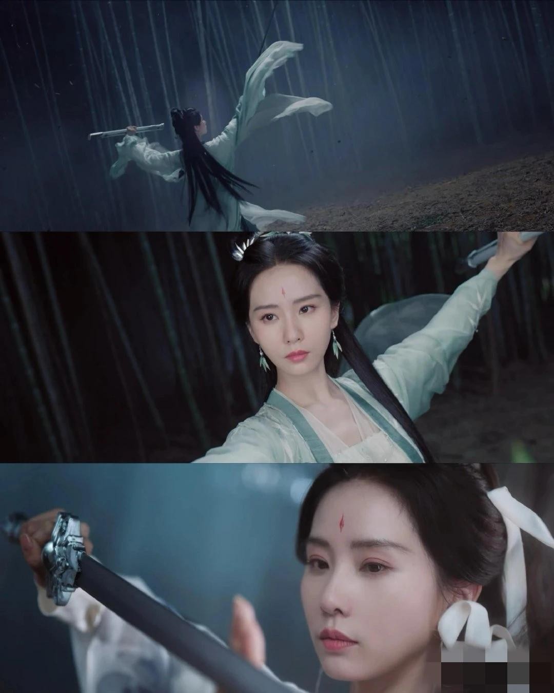 想象一下,碧绿色的衣裳如同清澈的溪水,缓缓流淌在刘诗诗身上。在镜头下,她就像是从古代画卷中走出的女子,衣袂飘飘,步步生莲。