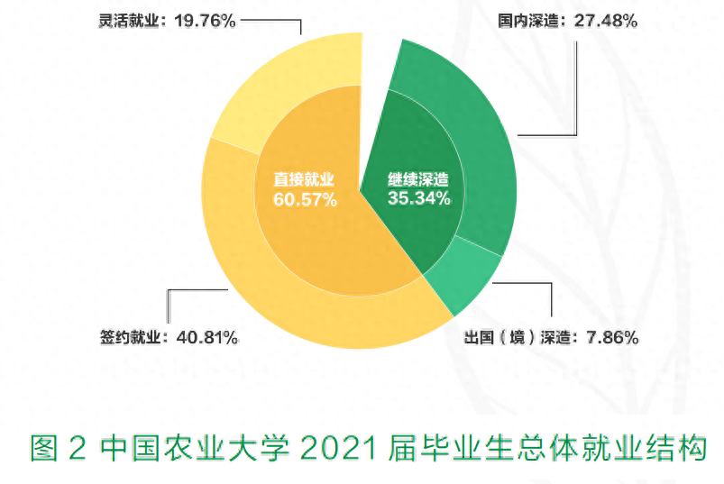 上图为中国农业大学2021年毕业生总体就业结构,其中升学的总比例有35.34%,签约就业的比例有40.18%。