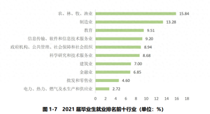 可以看出,大部分毕业生是流向企业单位,就业最多的行业是农、林、牧、渔业和制造业。