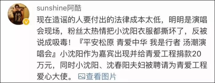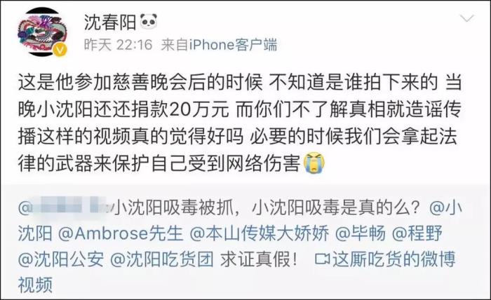直到当天晚上10点,小沈阳的妻子@沈春阳 发布了一条辟谣微博,表示视频为小沈阳参加活动后的情景,“吸毒被抓”一说属谣言,并谴责网民无事生非随意造谣,必要时会行使法律武器保护自己。