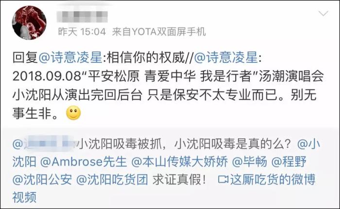 当晚10点多,小沈阳的妻子@沈春阳 亲自转发辟谣,表示这段视频是小沈阳参加活动时被粉丝围堵的情形,“吸毒被抓”一说属造谣。