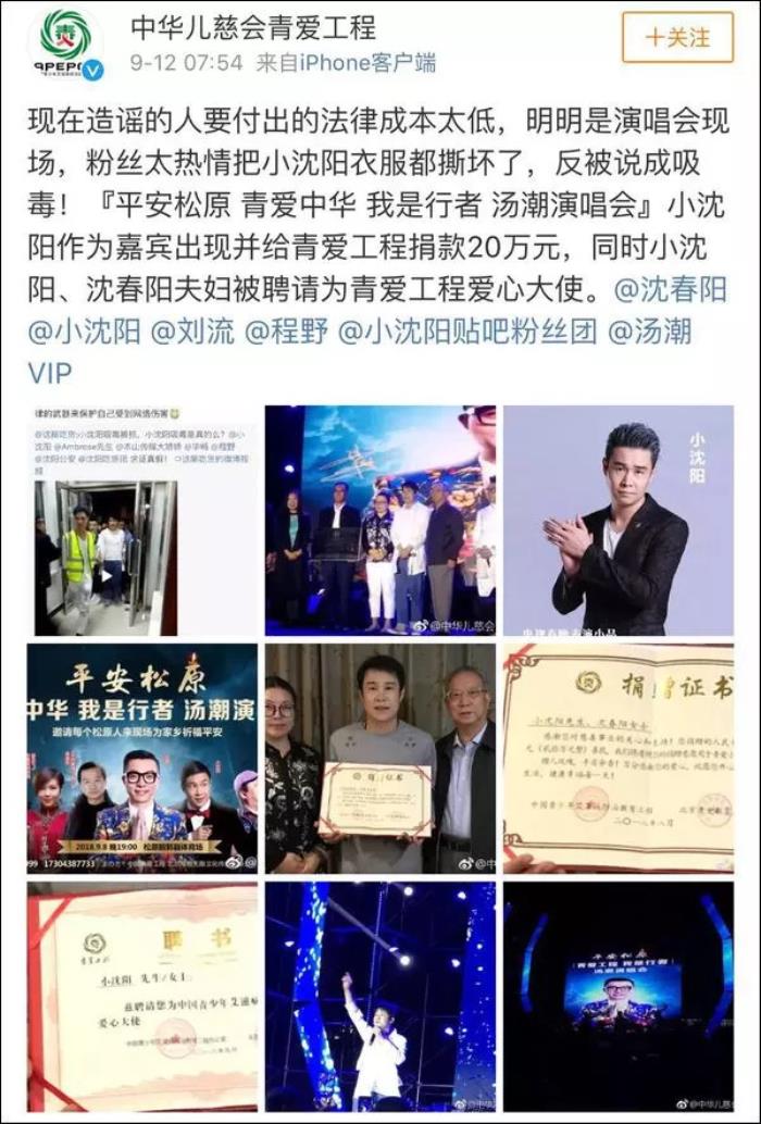 前天,慈善晚会的主办方@中国儿慈会青爱工程 也发布了一条微博,放出多张活动照片进一步证实辟谣,表示小沈阳不仅在慈善演唱会上表演,还为青爱工程捐款20万,小沈阳夫妇两还被聘请为青爱工程爱心大使。