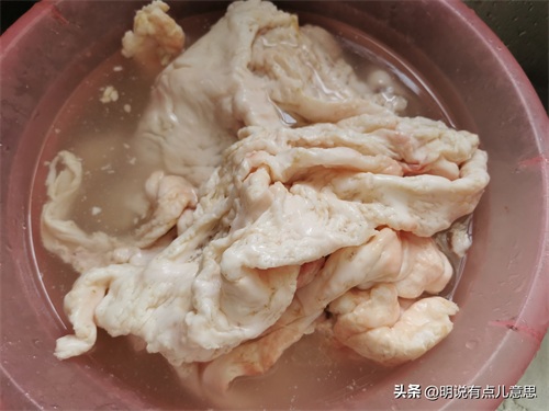 6、事后盘点,这次熬羊油的过程中,焯水的时间有点儿长,结果焯水后的水凉了之后也结了一层白乎乎的油,不仅浪费,而且给后期的洗刷增加了难度。后来我又烧了一锅热水把笊篱、勺子、铲子刷了一遍,炒锅上的油我没刷,准备炒菜的时候直接用了。
