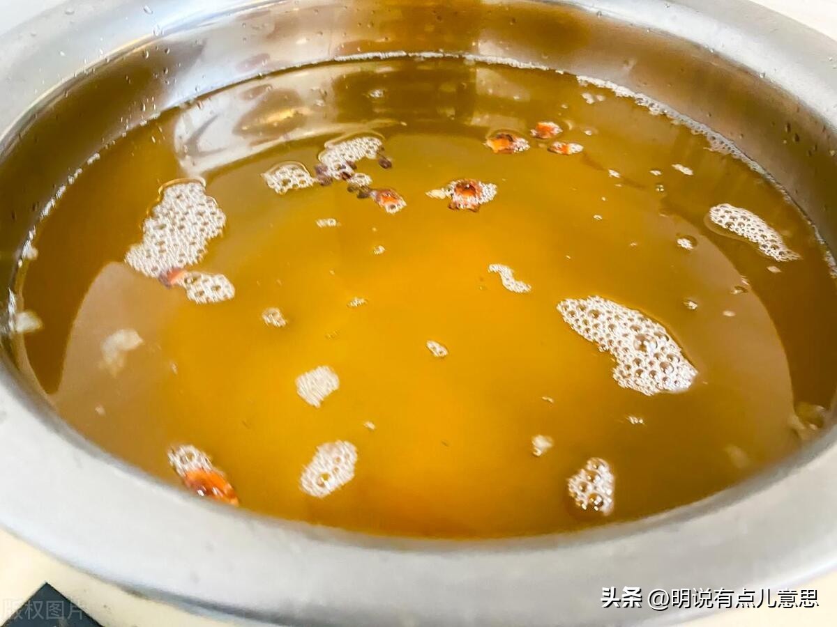 5、这时用笊篱把油渣子捞出来,放在旁边的碗里(这个油渣子可以包包子或者包饺子,因为熬的轻,淡黄色的,很香,下次再开一篇)。捏一撮花椒壳丢进锅里,轻轻扒拉几下,然后关火,这时候的油汤是很清澈的淡黄色。拿出提前准备好的大碗,把连着花椒壳的油汤倒进碗里,也可以根据个人口味用密网的笊篱过滤一下,把细小的油渣子也过滤出来(我就没费那个事,全倒碗里了),正好满满一碗。油炸和油汤都是黄亮亮的。