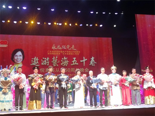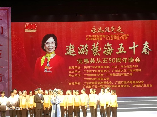 10月15日晚上,位于广洲大道中的广东艺术剧院一片灯火通明,粤韵悠扬,欢声笑语,掌声不断。这里正在举行“遨游艺海五十春一一倪惠英从艺50周年专场演出。这次专场活动是由中共广东省委宣传部、中共广州市委宣传部为指导单位,广东省文化旅游厅、广州市文化广电旅游局主办,广东省粤剧促进会、广州市粤剧院有限公司、广东省演出有限公司承办,并得到广东省繁荣粤剧基金会、广州市振兴粤剧基金会和广东省广府人珠玑巷后裔海外联谊会等大力支持。是“永远跟党走“广东省庆祝中国共产党成立100周年“艺术名家新人专场“之一演出的。晚会由粤剧表演艺术家倪惠英领衔主演,向羊城戏迷讲述她与粤剧相依相伴走过半世纪的艺术人生。