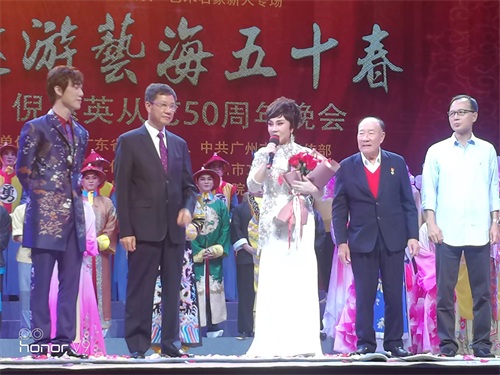倪惠英是广东省文联副主席,广东省粤剧非遗传承人,被称为“金嗓子”“小曲王”,是当代粤剧舞台上文武双全的粤剧表演艺术家,她开创了“都市新派粤剧”的探索之路,并致力于粤剧的传承与发展,为粤剧积极鼓与呼,推广“粤剧进校园”“大学生走进剧场”,编创“粤韵操”,编纂《粤剧表演艺术大全》。晚会还举办《倪惠英艺术人生》新书首发式。“粤剧是我的生命依托。五十年时光,在人类历史长河中只是短暂瞬间,但在我的一生中却是最宝贵的年华,粤剧已经融入我的生命。”倪惠英开心地说道。