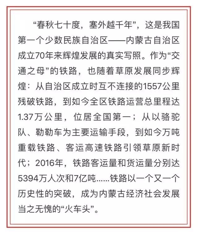 而如今,70年后的内蒙古,告别了“缓行”的年代,高铁的到来,让“日行千里” 成为可能。让每个身居在内蒙古的居民都能将草原的壮丽尽收眼底,也能乘坐高铁去感受更远的山河。