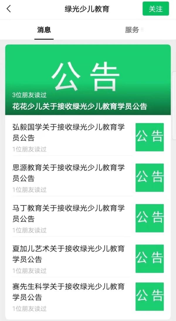 绿光教育也在公众号上陆续公告了愿意接收学员后续学习的机构名单。除了艺术、兴趣班类的课程,也有部分机构开放了新概念英语等课程供家长选择。
