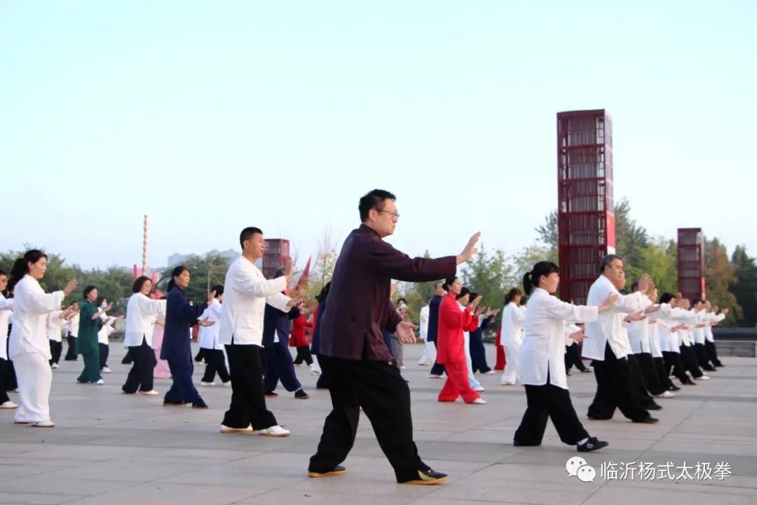2021年9月29日清晨,临沂市杨式太极拳委员会会长、杨式太极拳第六代传人张新博迎接赵幼斌先生、赵亮老师来到了沂河畔的雕塑公园,这里有临沂市各地的近三百名太极拳爱好者,其中临沭和平邑两县的拳友,从百里之外赶了过来。大家一起进行练太极、迎国庆的大型晨练活动。