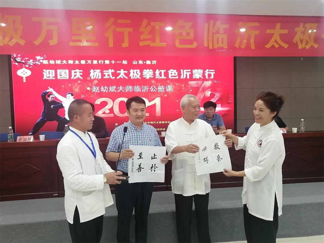 张新博会长代表临沂市武协、临沂市杨式太极拳委员会给赵幼斌先生赠送了文房四宝,彰显书圣故里的特点。赵老先生也回赠了墨宝“敬艺乐群、止于至善”