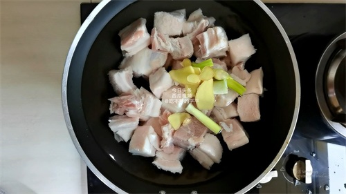 然后开始煮肉,锅中加入适量的清水,将清洗干净的猪肉冷水下锅,锅中加入几片生姜、葱段,加入2个八角以及花椒,加入几勺白酒去腥,开大火烧开,再撇去浮沫