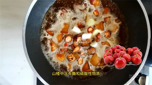 锅边加入啤酒,再加入清水,没过红烧肉,再次加入少许葱段姜片。然后加入少量山楂片,山楂中含有酶和酸性物质,能促进肉类蛋白质分解,使得红烧肉熟得更快,还能解油腻助消化,是降血压和胆固醇的小能手。